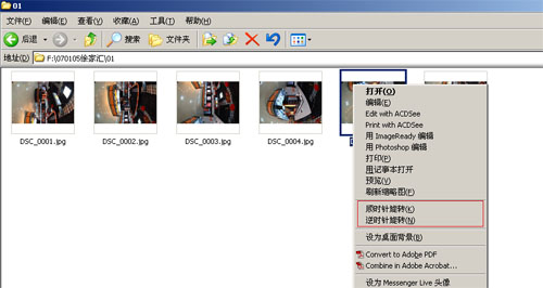 如果我们批量拼合全景时,必须先把图像批量旋转一下,方可进行拼合,否则都不能拼合成功。但是,使用其他软件可能会比较麻烦,利用系统自带的旋转功能就会方便很多。右键点击选中的图片,在右键菜单中选择顺时针旋转或者逆时针旋转即可。