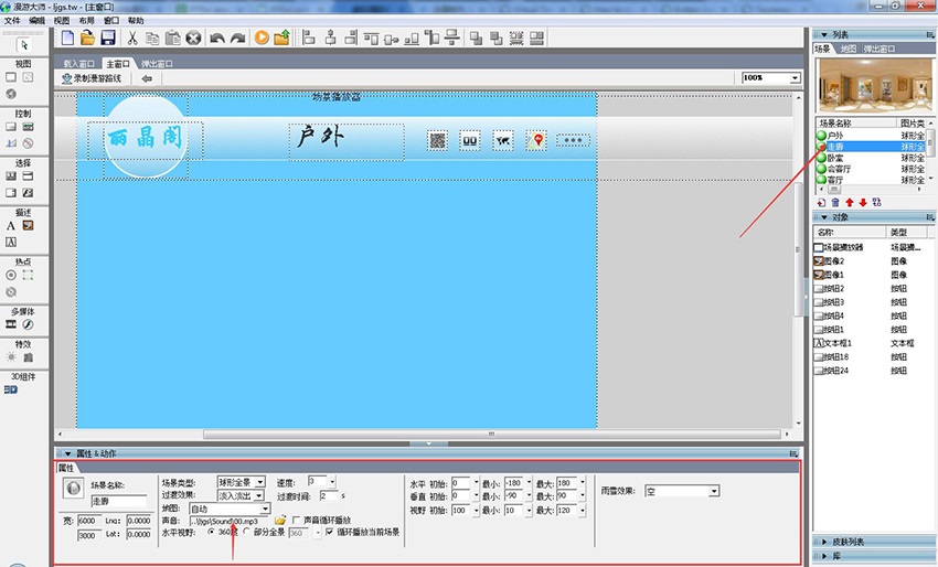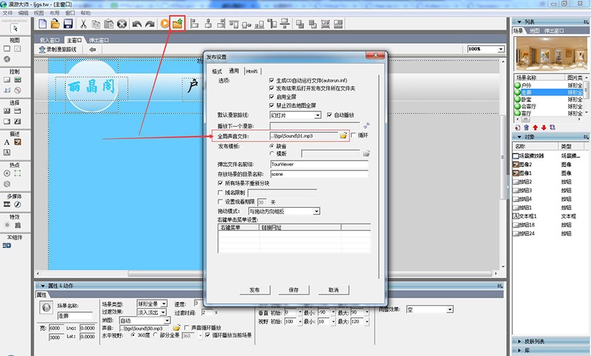 2.单击场景列表中的场景,在属性中找到声音项,添加单个场景的背景音乐。