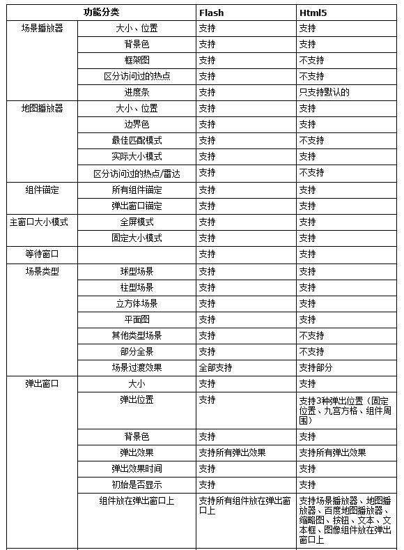 Flash播放器与HTML5播放器支持的组件也是不一样的,完整详尽的功能对比可以参考漫游大师软件使用说明书的【FLASH与HTML5功能对比】部分 。以下列出部分功能对比图: