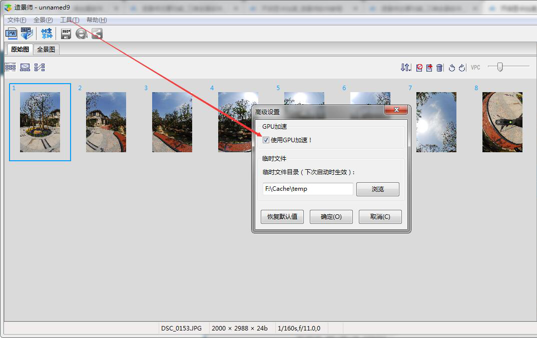 造景师中支持启用显卡加速功能,可以让拼接保存发布全景图的时间更短。具体的启用很简单,参照如下步骤开启即可: