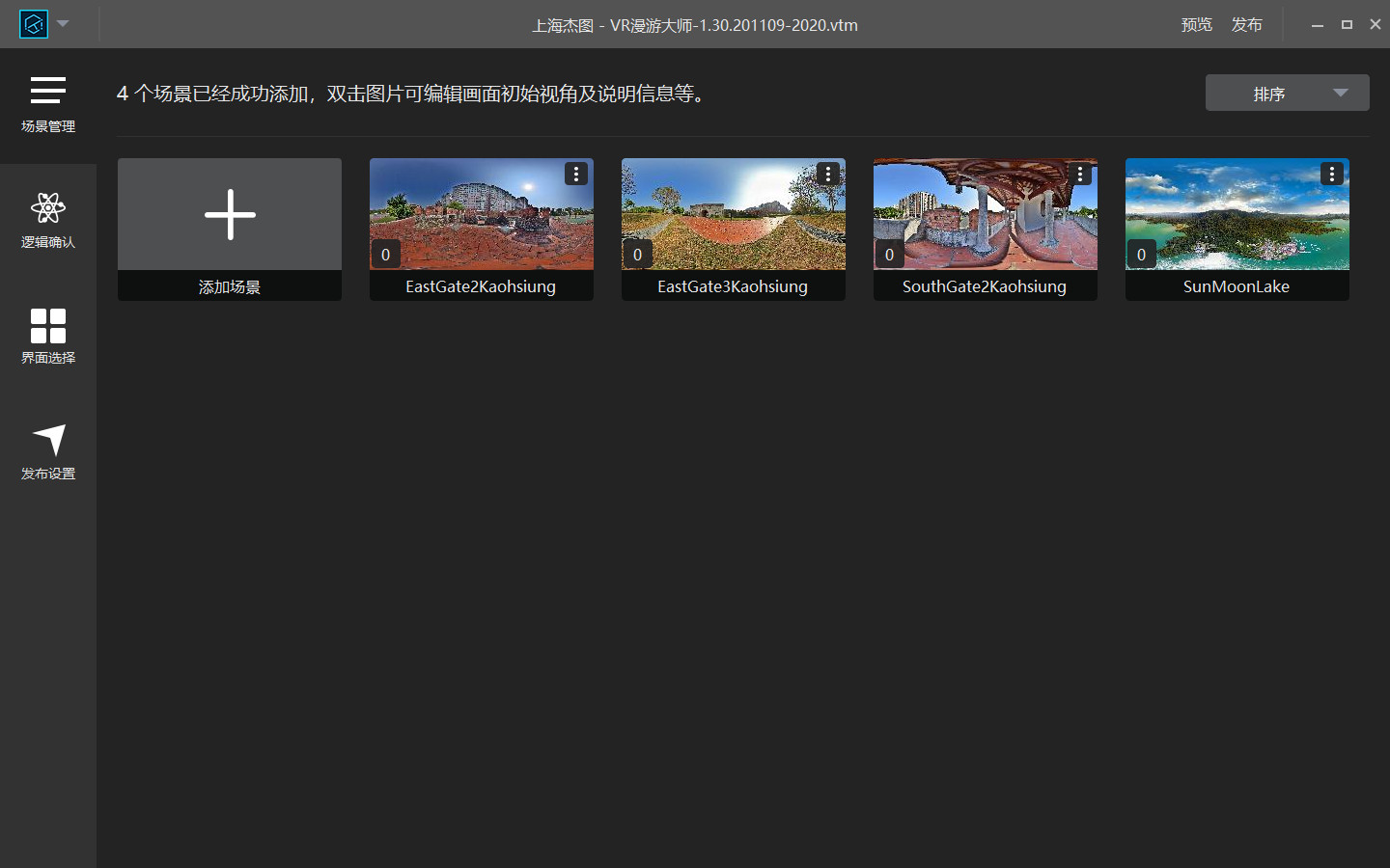 在新建工程后,选择工作流菜单中的场景管理,然后点击添加场景的按钮图标(如下图),出现打开图片对话框,浏览本地准备好的球型全景图素材文件夹,选中素材打开,就能在场景列表中看到添加的场景。