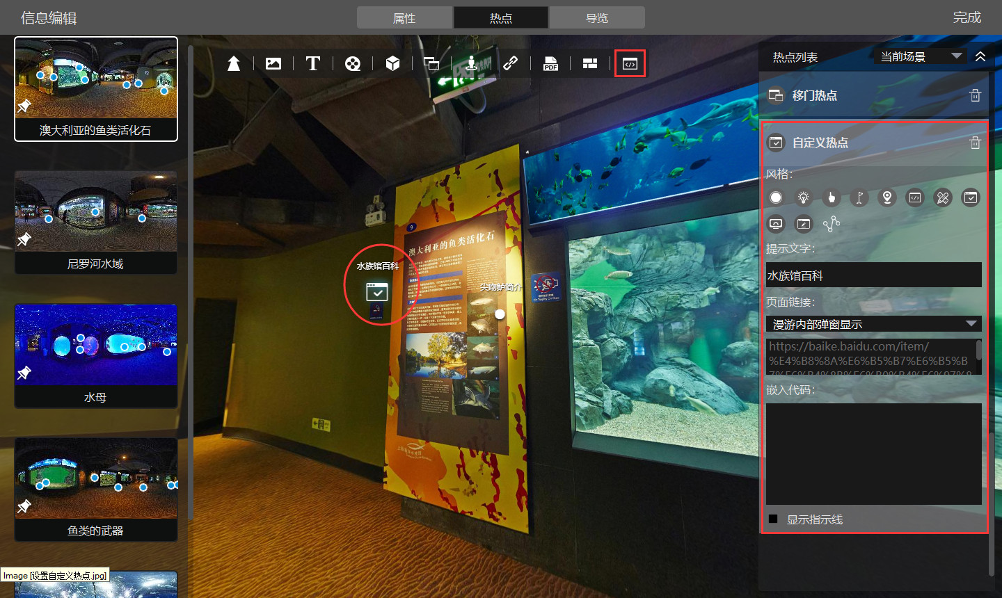 从工作流菜单的热点管理,选中右侧一个待添加自定义热点的场景,进入热点管理界面。 选择界面中上位置的自定义热点图标 就添加了一个自定义热点在当前场景视图的中心,拖动热点到合适的位置。软件提供5种自定义热点的图标风格给用户选用。