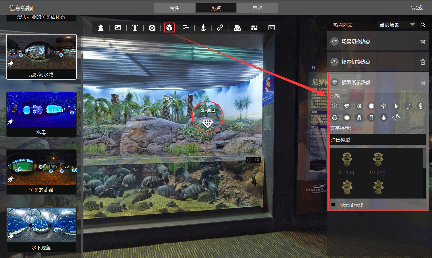 为模型展示热点。点击即为在当前场景区域的中间位置添加了一个模型类型的热点,可以根据需要将热点移动到合适的位置。右侧的热点属性编辑区域包含以下的属性信息可供编辑或选择。