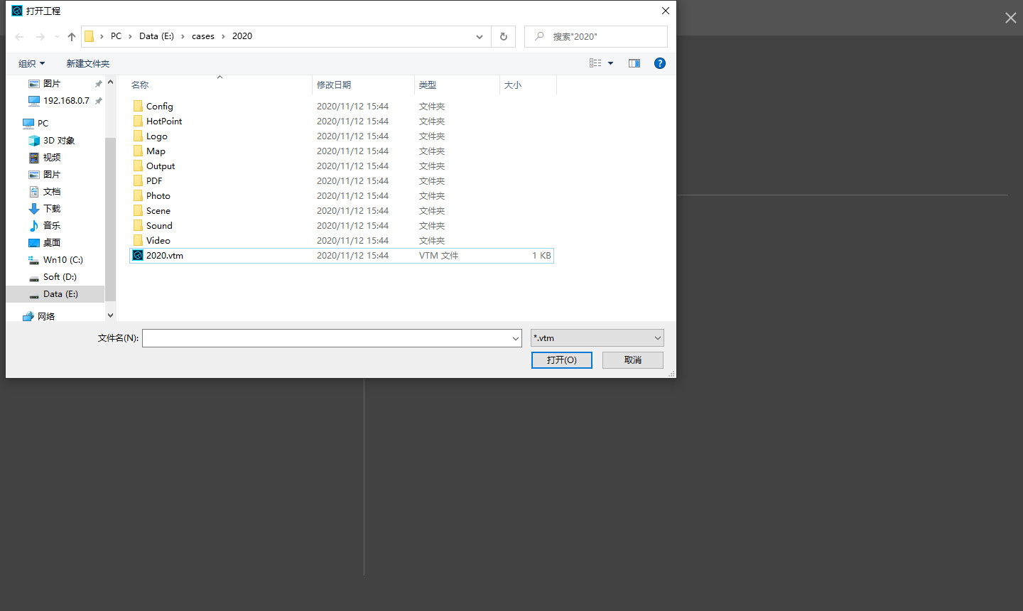 打开工程可以在软件打开的初始界面(图四)打开工程按钮或者直接双击近期的工程(如果近期编辑过,且没有移动过工程文件夹)进行操作,也可以在当前工程界面点击菜单栏(图五)中的打开工程或者打开近期工程中选中相应工程开始操作。图六为选中的工程文件*.vtm。