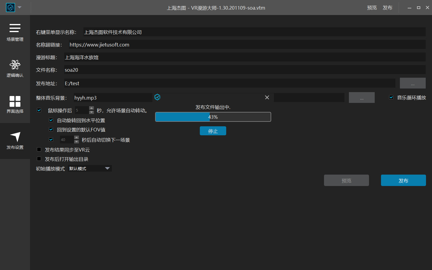 在预览漫游后确认所有效果基本无误,就可以在完成相应的发布设置选项后发布漫游。如下图所示,根据需要设置相关项,点击发布按钮或者软件右上角的”发布“开始VR漫游工程的发布。