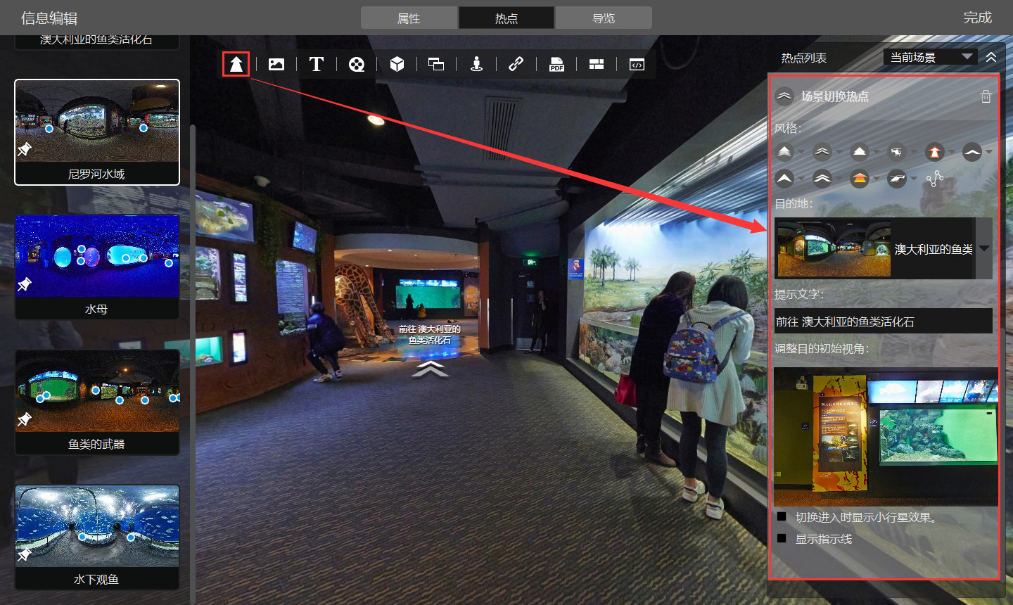 为场景切换热点图标,限定的过渡效果为走入效果。右侧的半透明区域为热点属性设置相关项: