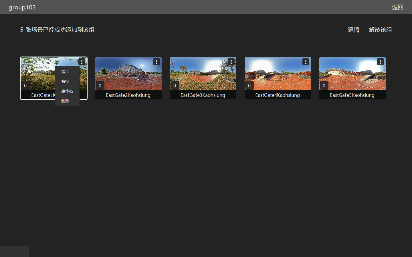 将所有的场景都拖入到相应的分组中,单击分组名称修改分组名。双击任一分组进入该分组中,如下图:点击每个场景右上角的功能图标可以对当然场景置顶,替换、重命名、删除当前场景。也可以手动拖动场景调整场景顺序,拖放场景到指定的位置。