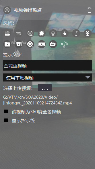 为视频弹出热点。点击视频热点后就在当前场景视野的中心添加了一个视频弹出热点。拖动热点可以调整热点的位置。右侧热点属性编辑框包含以下信息: