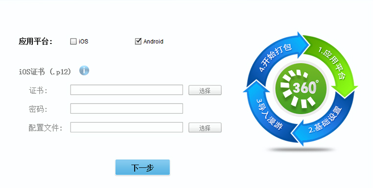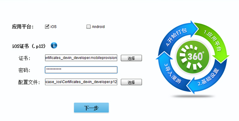 打开全景app选择ios应用平台,从本机路径中添加证书和配置文件,并输入密码点击“下一步”。如果你还未申请苹果开发者证书,请参照我们提供的申请教程。