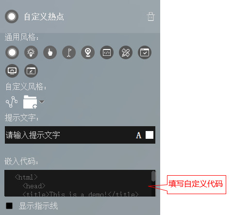 设置用户自定义热点内容。在“嵌入代码”文本框中填写自定义代码。自定义代码仅支持Html和CSS代码,不支持Javascript脚本。
