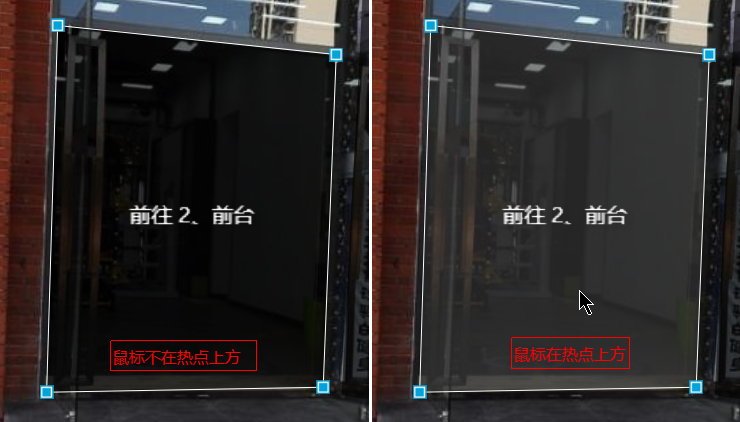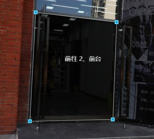 逐个拖动蓝色的手柄,可以进一步调节多边形的边框。漫游播放器中,点击多边形热点的整个区域都会激发该热点的功能。