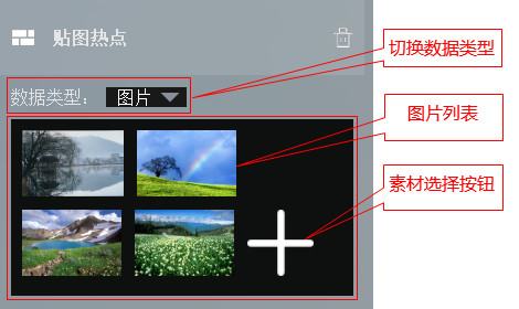 点击复选框“数据类型”,用于设置将要贴的数据的类型。目前支持“图片”和“视频”。当选择不同的数据类型时,下方的属性设置项会发生相应的改变。