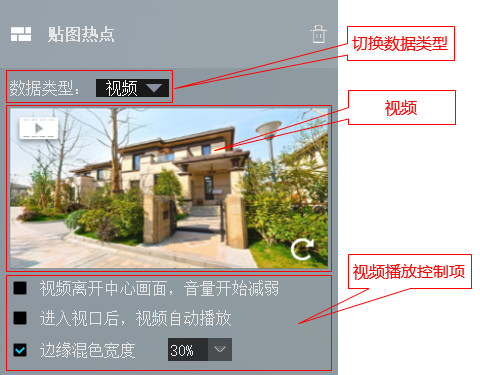 检查框“进入视口后,视频自动播放”,表示场景转动时,贴图热点一旦进入全景播放器视口可见,则自动播放。