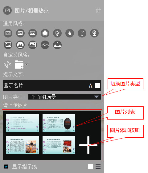 设置图片相册热点对应的图片集合或者360全景图片。