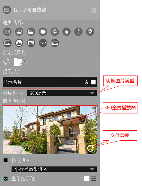 。用户可以通过拖拽360全景播放器,设置初始进入该全景图的角度,也可以通过点击“文件替换”按钮重新选择360全景图。选中检查框“特效进入”,下方的复选框将可以选择初始进入该场景时的效果,目前支持小行星、鱼眼和水晶球三种效果。
