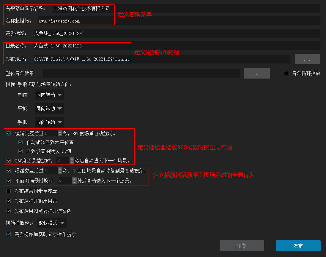 发布设置用于定义漫游播放器的右键菜单、网页标题、发布路径和背景音乐等属性,以及发布相关的一些杂项设置。