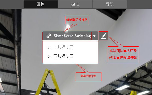 进入姊妹图的场景信息编辑对话框的属性编辑页,可以看到在播放器中间靠上的位置有一个姊妹图切换按钮,如下图所示: