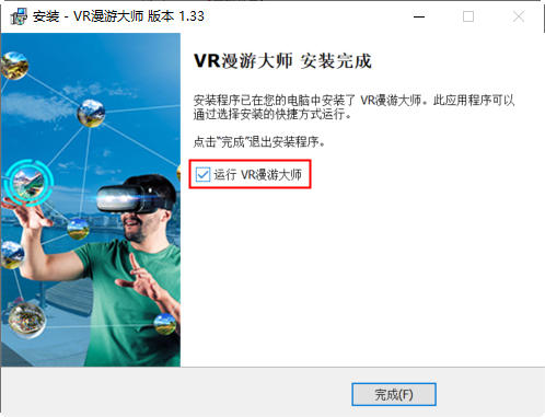 安装完成后,如果勾选了“运行VR漫游大师”,请先确认加密狗驱动程序是否已正确安装且加密狗已经插入电脑USB接口,否则,软件会运行失败。关于加密狗使用问题,可以参考本文档关于加密狗的章节。安装过程到此就结束了。
