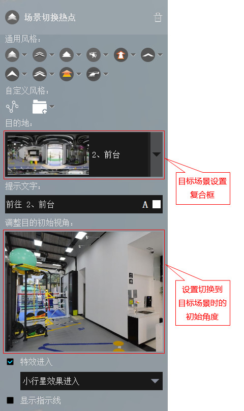 选中“特效进入”检查框,下方的复选框将可以选择具体的效果,目前支持小行星、鱼眼和水晶球三种效果。选择了具体效果后,表示切入该目标场景时,目标场景初始显示该效果,然后自动过渡到普通效果。