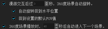 o “回到设置的默认FOV值”:表示播放器开始自动转动后,如果场景的FOV有变化,则首先调整FOV为场景默认的FOV。如何设置场景初始FOV,参见“设置初始视角”。