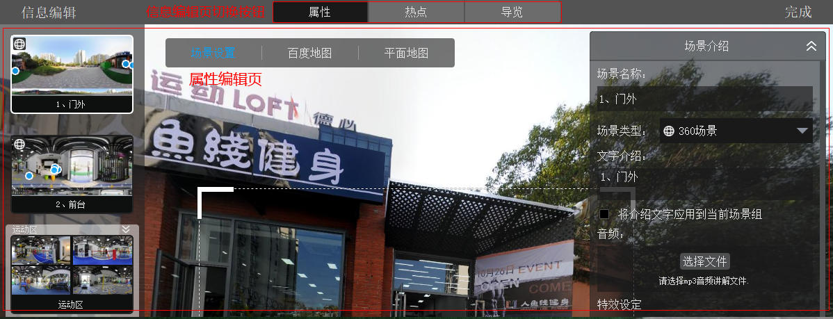 场景信息编辑对话框用于场景属性的编辑。场景属性包括场景基本属性、场景热点和场景导览。通过点击按钮“属性”、“热点”和“导览”切换对应的页面,分别进行编辑,如下图所示: