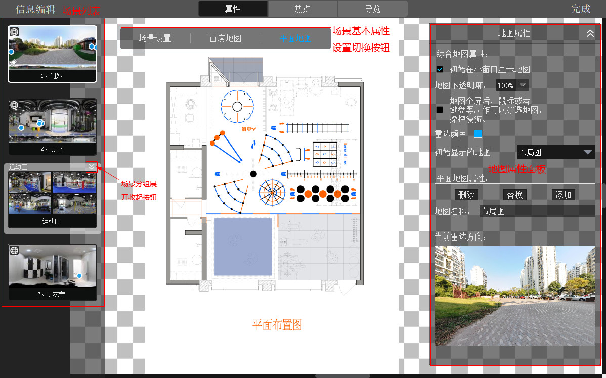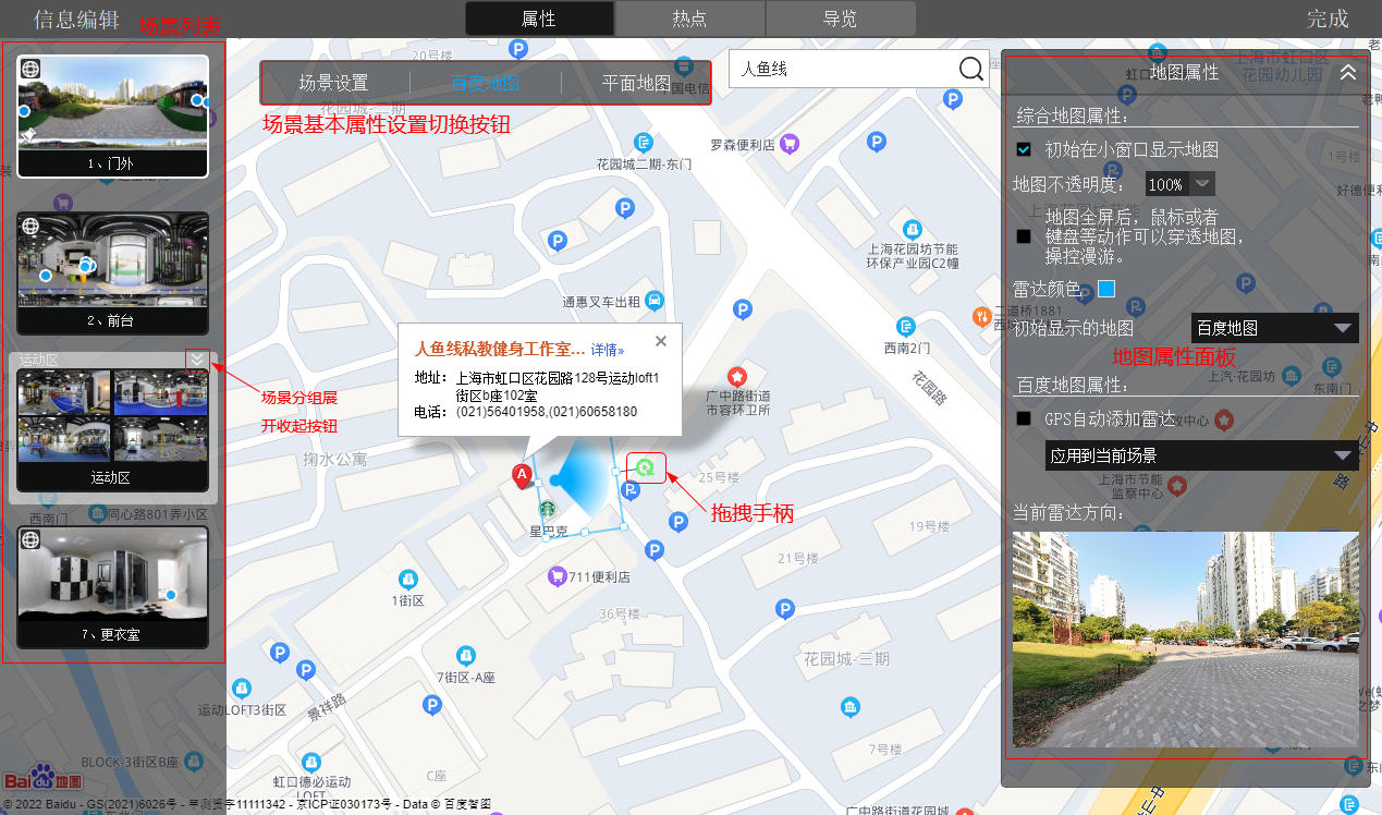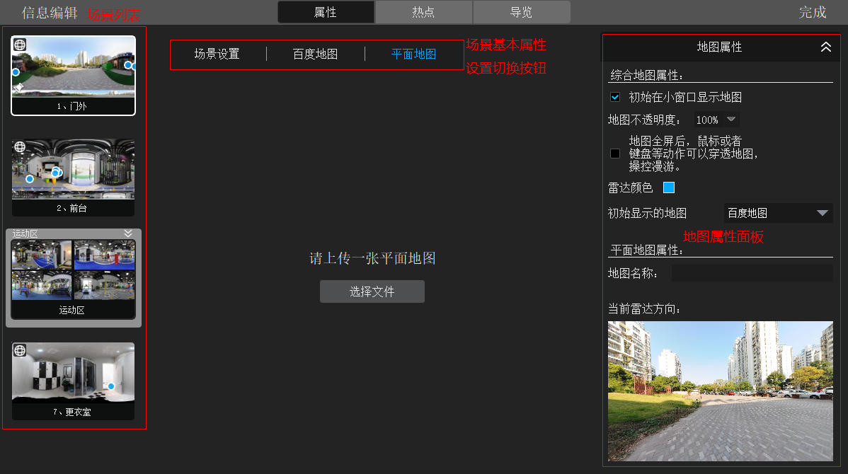 通过点击“场景设置”、“百度地图”和“平面地图”三个按钮进行切换对应页面进行编辑。