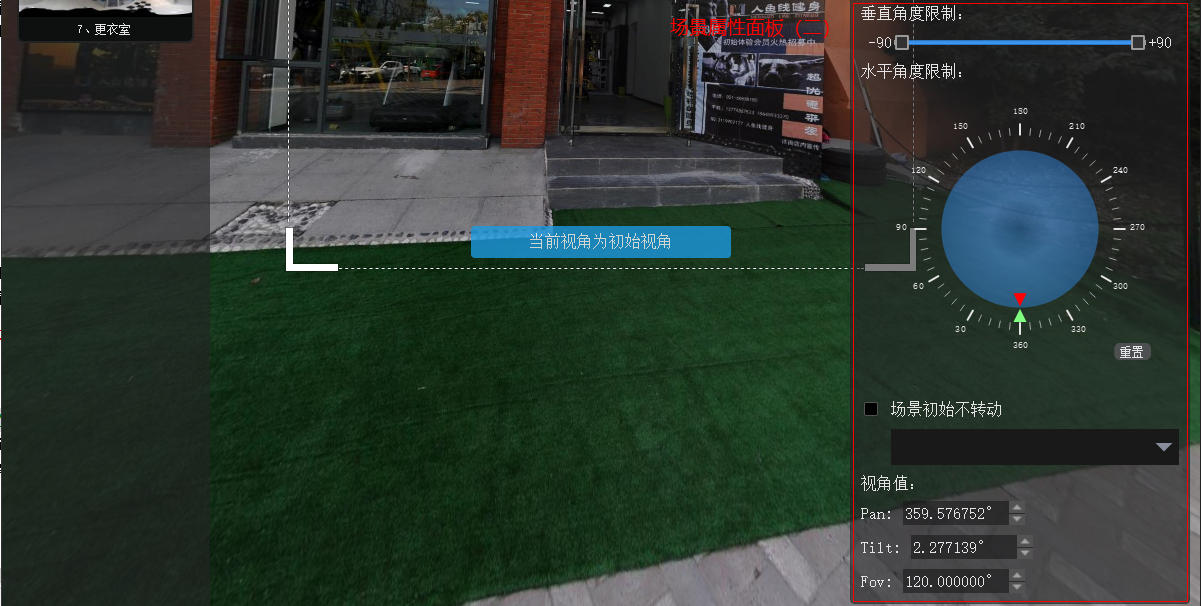 视角限制:用于设置播放器进入该场景时的初始视角,及拖动时的视角限制。使用方法参见:“设置初始视角”,“设置角度限制”。
