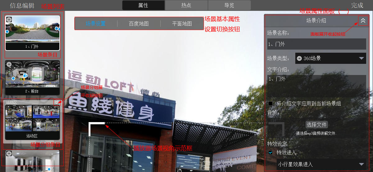 包括场景名称、场景介绍、场景声音、特效设定和视角限制的设置。