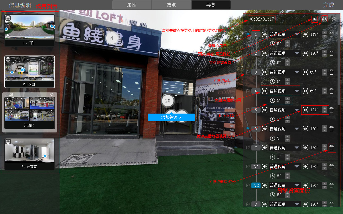 导览路线为一条预先设置好的,VR漫游自动播放的路线。该功能可以引导观看者观看漫游中希望关注到的地方。用户可以在一个场景或不同场景中添加关键点,来制作导览路线。